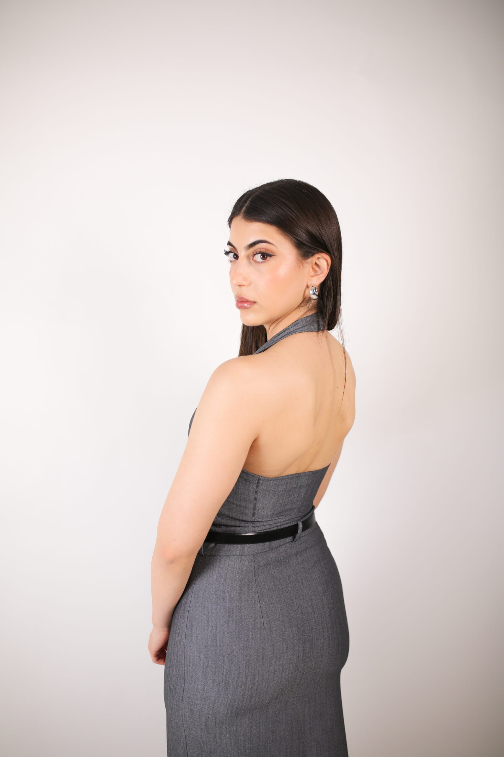 The Old Times Top is where suiting meets sensuality. With a tailored halter neckline and precisely placed seam lines, it contours the torso while highlighting the shoulders and collarbone. Designed in a soft stretch suiting fabric with a subtle pinstripe, this top brings sophistication to any look—whether styled with the matching skirt or layered under a blazer.