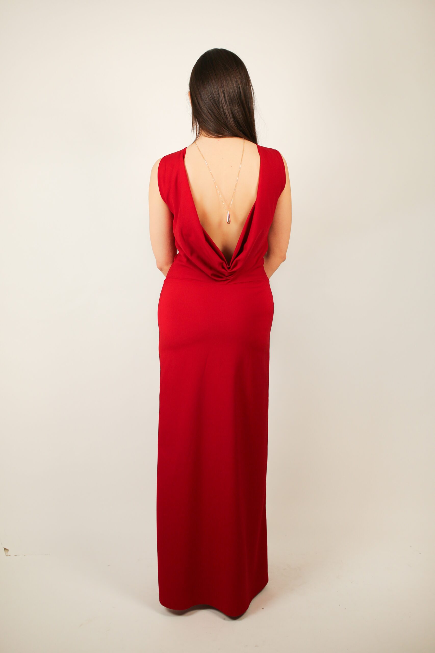 The Sunrise Dress is pure cinematic glamour. Cut from the matte side of satin charmeuse, it offers a soft, subtle glow that feels as refined as it looks. This deep crimson silhouette features a high bateau neckline and a low, draped open back that reveals just enough. A thigh-high slit adds movement and quiet drama, making every step a statement. Sophisticated from the front, unforgettable from the back—this is your evening to remember.