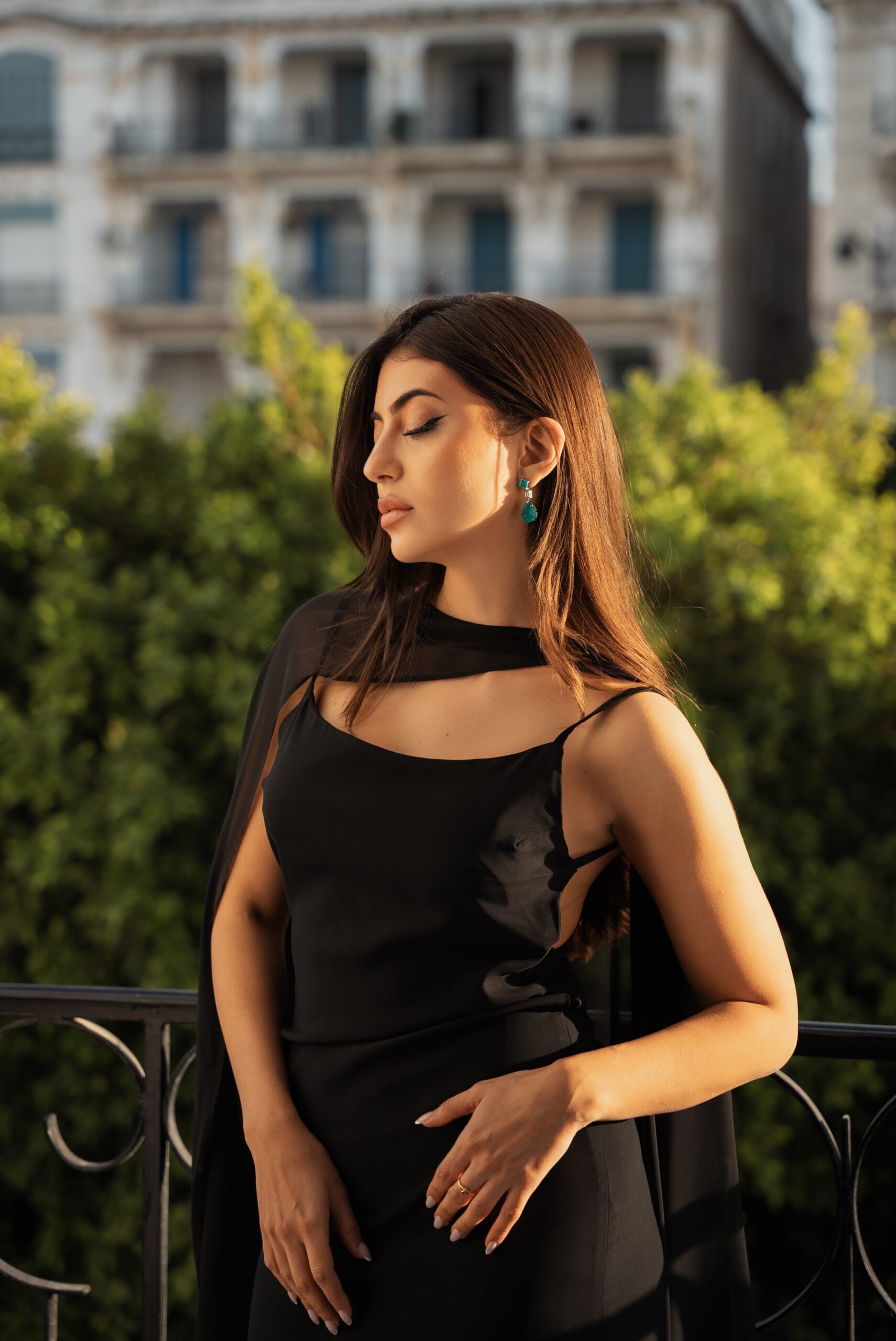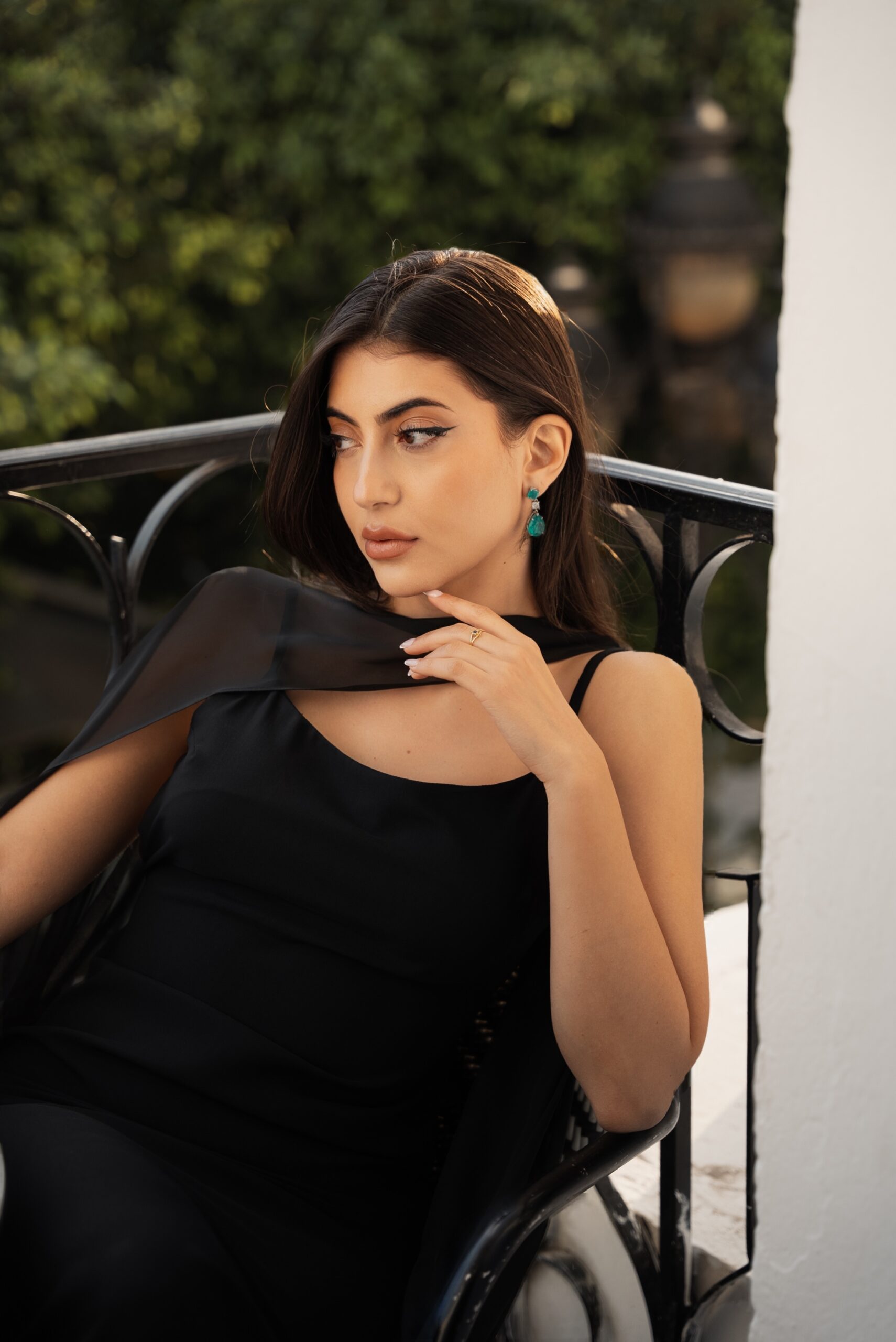 The Aria Dress is made from soft stretch crepe that moves easily with the body. It has an open back and a long, fluid shape that feels effortless. The light mousseline cape rests on the shoulders, adding softness and a sense of movement.